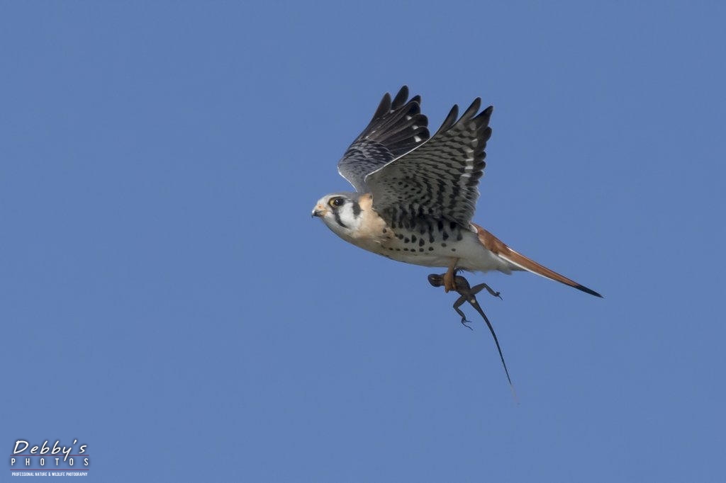 FL3129 Male American Kestrel in flight with lizard