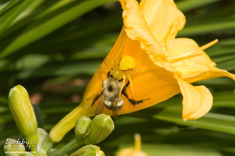 Comments: 1804 Yellow Crab Spider with Captured Bumblebee, Daylily