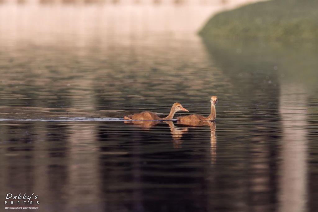 FL3384 Sandhill Crane Colts swim ashore from their nest island every morning